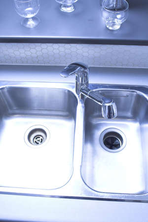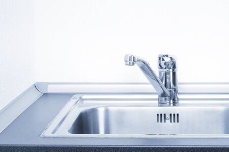 Faucet and metal sink, closeup on the kitchen. Blue tone