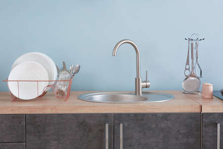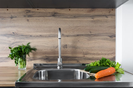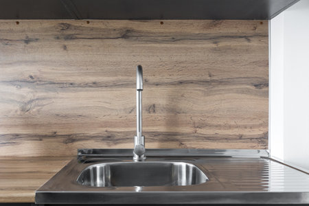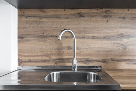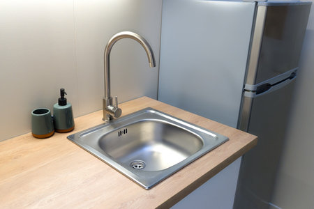 modern interior stainless steel sink with aluminum faucet on a wooden worktop next to the kitchen fridge