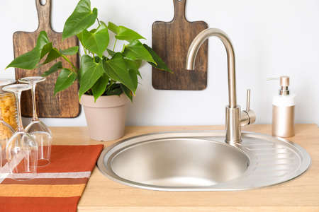 Kitchen sink and faucet. Painted chrome kitchen sink fit in wooden countertop with tap water and liquid soap pump bottle. The contemporary interior of the modern kitchen for home and apartment