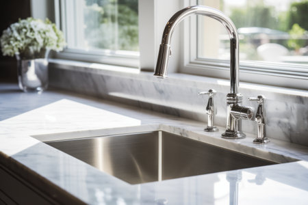 Clean chrome sink and a window with nice garden view in the background. Concept for a beautiful and modern kitchen. Marble countertop