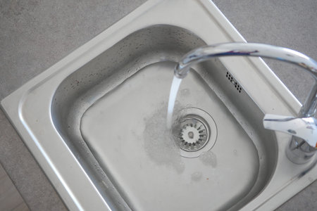 Stainless steel sink and water drain in a modern kitchen, water flow in the kitchen sink, water goes from the drain