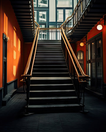 Bangkok, Thailand - 29 Oct, 2025 - A prominent, industrial-style metal staircase climbs through a high-contrast environment, dramatically illuminated by natural light that carves sharp divisions of shadow and brilliance across its structure.