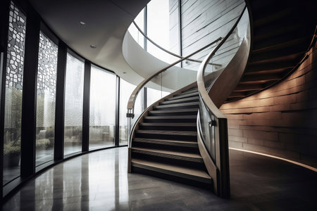 Modern and spacious office space interior design with a wooden spiral staircase and decorative plants. Generative AI AIG27.