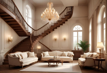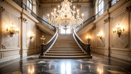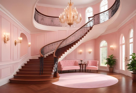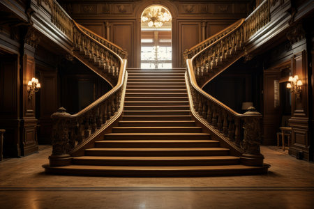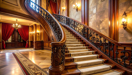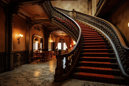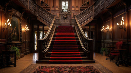 This image showcases the interior of a grand and opulent mansion,featuring a stunning hallway with intricate architectural details,including a magnificent staircase,ornate wood paneling,and a