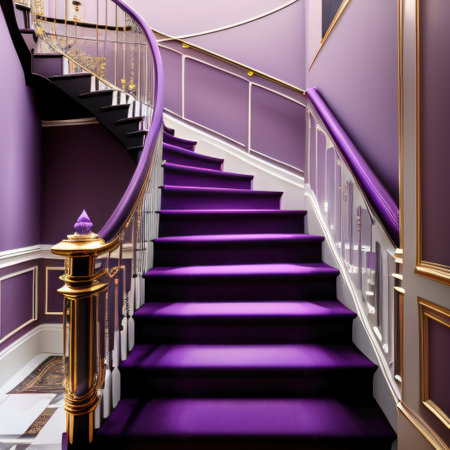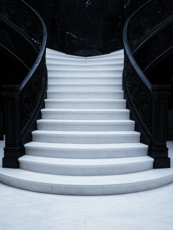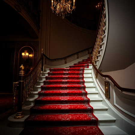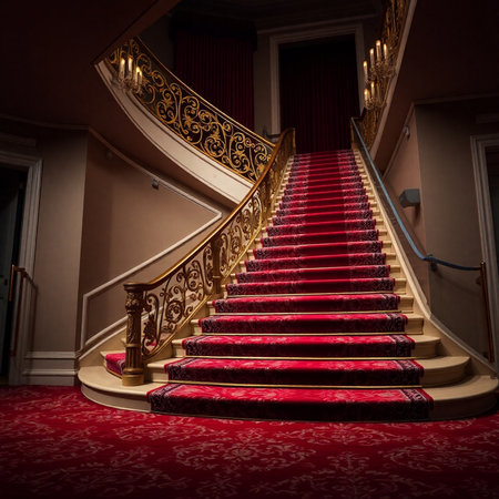 A luxurious yet unsettling staircase with dim lighting, fading into darkness at the top.