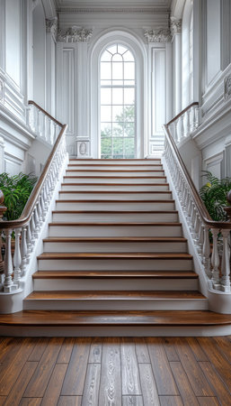 A grand, white staircase with wooden treads and ornate railings, leading to a window with a view of trees.