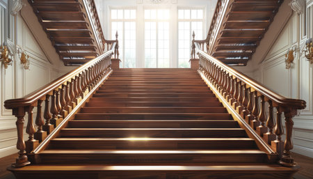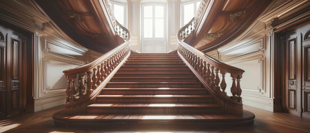 A view of a grand wooden staircase with intricate detailing and a bright window at the top, showcasing the elegant interior design of a luxurious home.