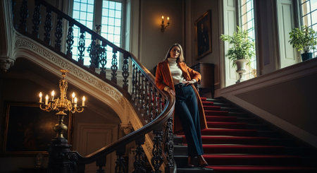 Beautiful young woman in elegant clothes posing on the stairs in a luxury apartment.