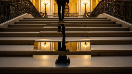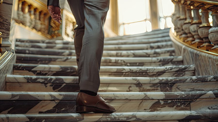 a man's leg gracefully ascending a luxurious marble staircase, adorned in gray suit pants