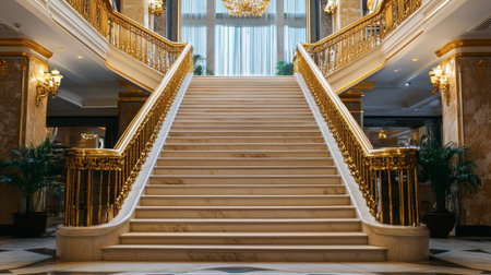 Grand staircase with ornate railings in a luxurious hotel lobby, illuminated by a grand chandelier.