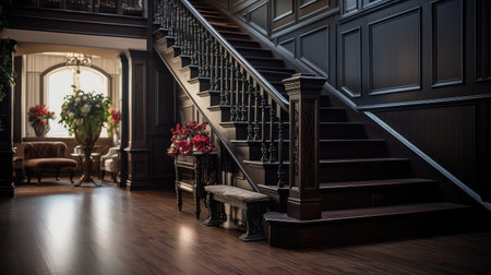 A hyper-realistic depiction of a hall with a staircase adorned with dark romantic flowers. The image captures the whimsical dreamscape of the Dusseldorf School of Photography, with its timeless elegance and rich tonal palette, while exploring dark themes.