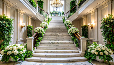 Wedding decoration with white flowers on the stairs in luxury hotel
