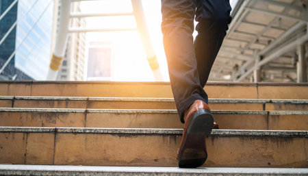 Close up of a businessmans shoes as they walk up a staircase. Career development and strategy