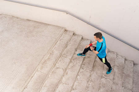 young man running up the stairs close up, sunny summer day outdoors in the city healthy lifestyle concept