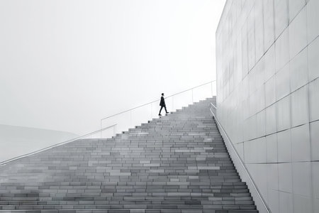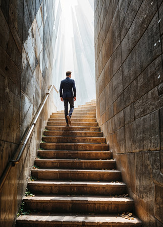 Man walking up set of stairs with suit on top of it. Generative AI.