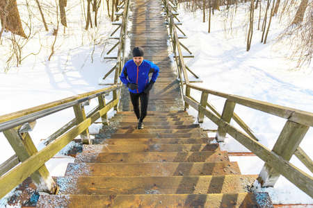 mature man running on stairs at winter in park