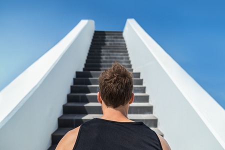 Fitness man looking ahead at stairs climbing challenge.
