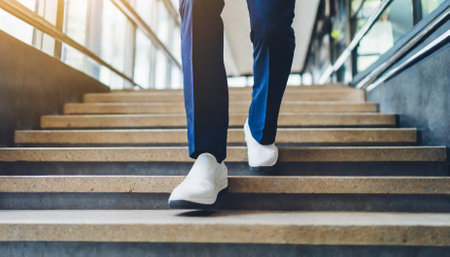 A person is walking up a set of stairs in their white shoes. Concept of determination and focus as the person climbs the steps