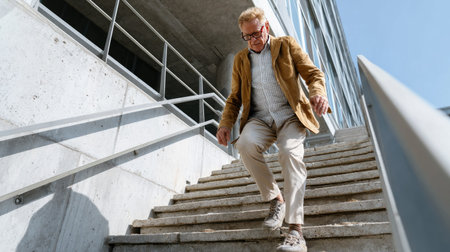 An elderly man in fashionable casual attire navigates down a concrete staircase in a modern architectural setting. The bright sunlight enhances the vibrant scene.