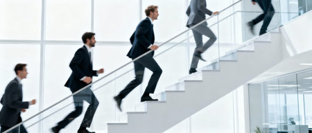 An energetic close-up shot of a young professional climbing office stairs in a rush, portraying motivation, hustle, and the drive to succeed, making it perfect for business and productivity