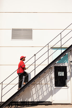 African American person climbing metal stairs up outside a modern white building Wall features lines and ventilation openings
