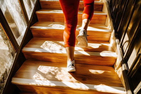 A close-up view of a person's legs running up a wooden staircase, showcasing determination and focus. - Generative AI