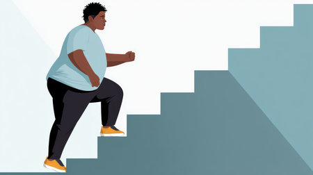 A man with obesity trying to climb stairs, showing determination.