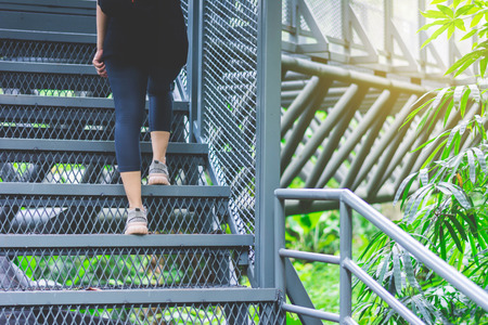 Closeup woman's feet in white sneakers walking up on the stair outside the building, step by step level concept