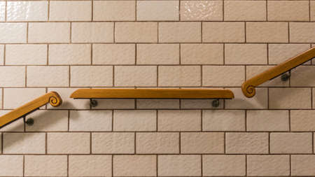 The wooden handrail up the stairs and the white tiled wall