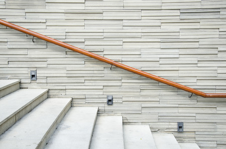 Light staircase with red handrails and concrete walls abstract background