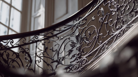 This photo captures an exquisite wrought iron railing featuring intricate floral designs, set in a vintage staircase, highlighting elegance and craftsmanship.