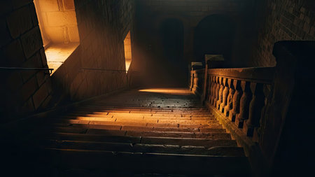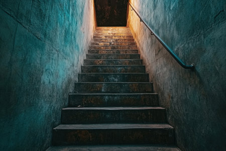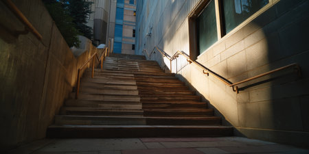 Close-up view of concrete stairs illuminated by soft light and shadows, creating an abstract and tranquil ambiance, perfect for artistic and architectural themes.