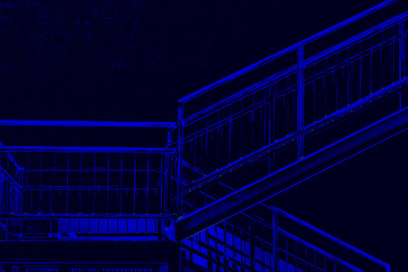 Blue metallic staircase landing and wall in dark blue night moonlight