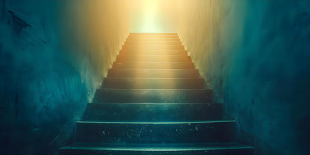 Stairs in the overhead light bulb at the top of the day reflects the path to hope and the next step.