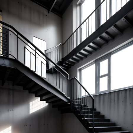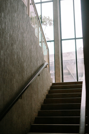 Sunlit Staircase in Modern Building Interior with Large Windows.
