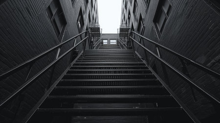 A monochromatic shot of a fire escape staircase, epitomizing urban utility and aesthetics.