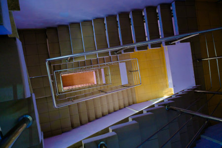 Selective blur on an old staircase, a swirling spiral stairway in a dwelling residential building, seen from above, from the higher floors, with a perspective effect till the bottom.