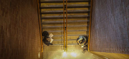 Business colleagues with take out coffee walking up the stairs and discussing work, view from the top