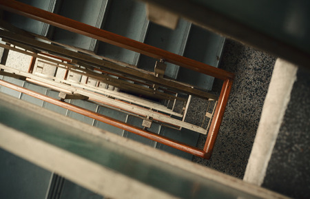 Wide-angle view from above of a long stairwell going down in a spiral in an old dwelling house with a metal railing and a lift shaft in the center, selective focus in the foreground, Lisbon, Portugal