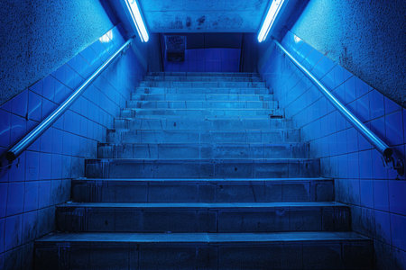 Neon lit staircase leading down into an underground passage.