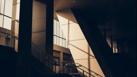 Sunlight creates shadows on the sleek, contemporary building with glass and metal surfaces