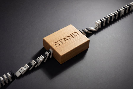 A solid wooden block engraved with the word stand stops a line of toppling dominoes from falling further, symbolizing resilience, stability and the ability to halt a crisis or chain reaction.
