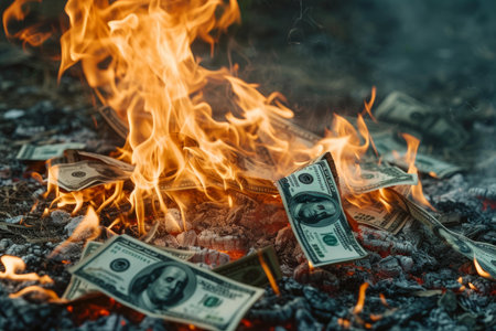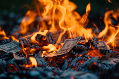 The concept of money burning in flames symbolizes the wasteful destruction of finances and wealth, as dollar bills go up in fiery combustion