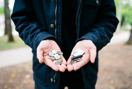 Hands of a young man holding coins and banknotes in the park