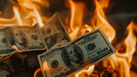 Close-up of dollar bills burning in flames, representing financial loss, economic downturn, and the destruction of wealth and investment