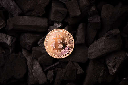 Bitcoin coins on gold and black colour background. close up