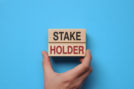 Minimalist flat lay of wooden blocks 'STAKE' and 'HOLDER' on vibrant blue background, ideal for business and investment-themed projects.