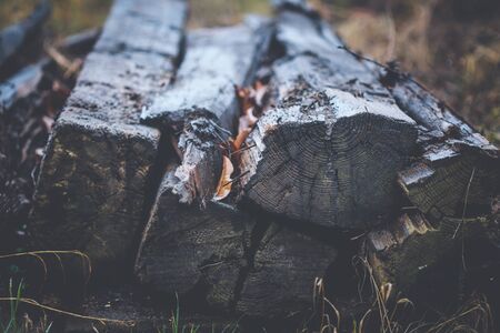 Old wooden decayed and ramshackle railway sleepers stacked up on side of railway line