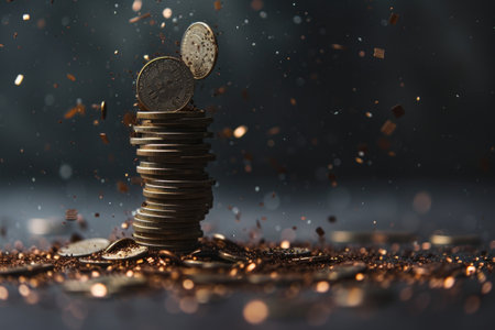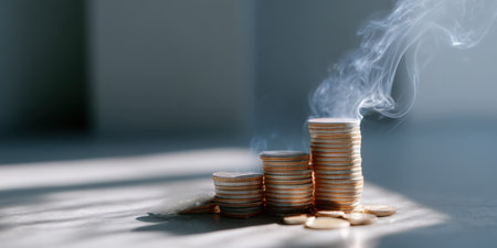 Stack of coins with smoke rising, symbolizing financial loss or burning money in soft light setting