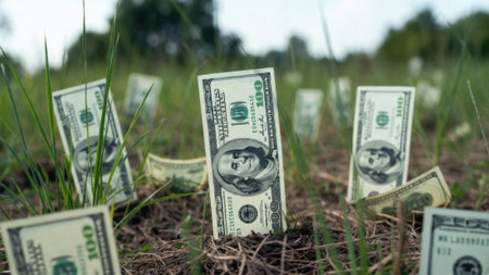 Us dollar bills appearing to grow from ground in outdoor setting.